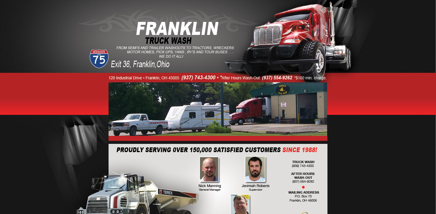 n 7 days a week. Located in Franklin, Ohio just off Interstate 75, Exit 36, down the way from Pilot Travel Plaza. (937) 743-4300. After hours Wash-Out Service, (937) 554-2723; From trucks, cars, buses, campers, trailers, dump trucks, motor homes, if it fits in out bay, we will wash it. Quick express washes, standard brush washes, and hand washes. The tops get brushed and the stacks get hand scrubbed too!