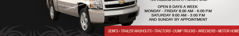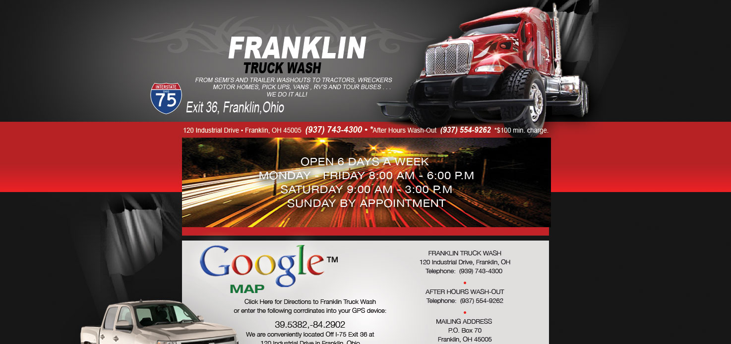 Open 7 days a week. Located in Franklin, Ohio just off Interstate 75, Exit 36, down th e way from Pilot Travel Plaza. (937) 743-4300. After hours Wash-Out Service, (937) 554-2723; From trucks, cars, buses, campers, trailers, dump trucks, motor homes, if it fits in out bay, we will wash it. Quick express washes, standard brush washes, and hand washes. The tops get brushed and the stacks get hand scrubbed too!